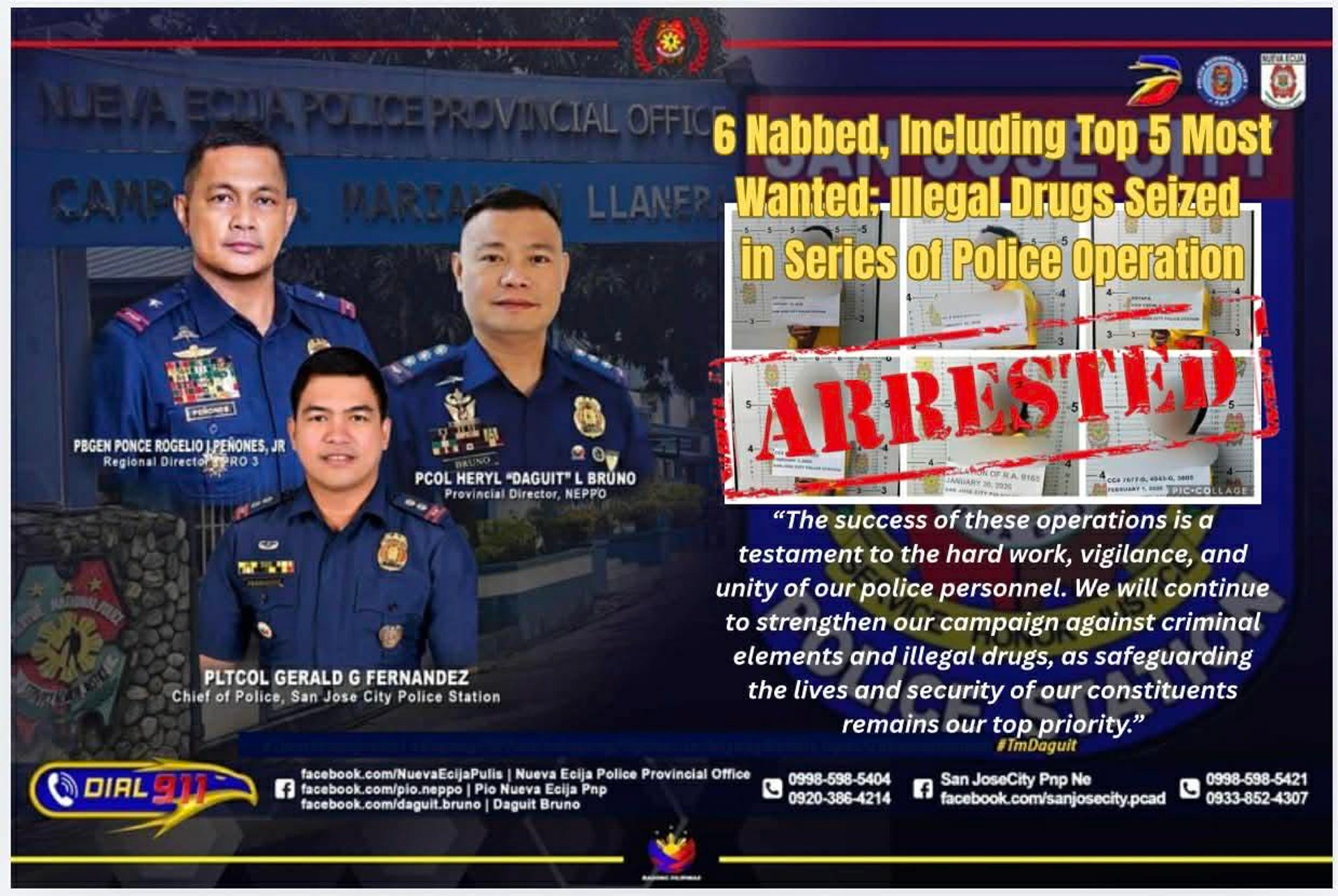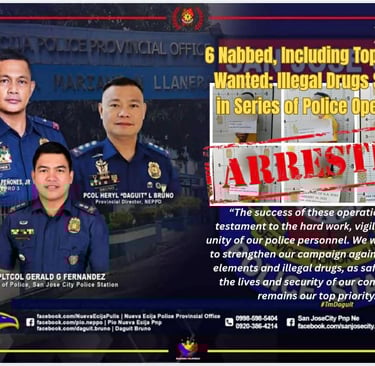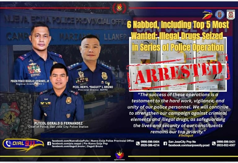 San Jose City, Nueva Ecija — A total of six (6) individuals were arrested while illegal drugs were confiscated in a series of successful law enforcement operations conducted by personnel of the San Jose City Police Station led by PLTCOL GERALD G FERNANDEZ, COP in coordination with PSOG, PIU, 2nd FOB, 2nd PMFC, and PSOG NEPPO, from January 28 to February 2, 2026, in San Jose City, Nueva Ecija and Baguio City.